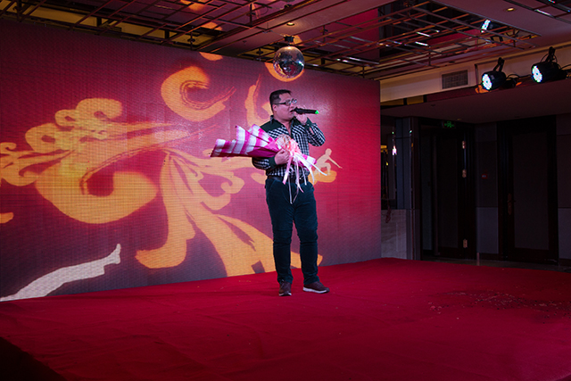第二环节是生产制造部林秋枫的脱口秀《生活真烦恼》,摇身一变知心大姐和我们唠唠家长里短生活烦恼,最后一曲《社会摇》结束了“生活的烦恼”。不得不佩服林姐的好口才啊!今年晚会节目的“亮眼之作”小品《绑匪》,真是让人眼前一片那啥啊(此处省略不说)。营销部的贾殿鹏和市场部的王元峰为了节目也是蛮拼的啦。贾经理那一头金色长发、和王经理那喜庆的肚兜儿,相信大家还是记忆犹新吧!集惊悚、悬疑、搞笑于一身的小品过后,在工程技术部夏寰宇的一首《你是我的眼》的歌声中节目告一段落。之后游戏《看数字猜成语》、《背连背,心连心》火热进行。同时由领导抽取幸运二等奖并颁发奖项。